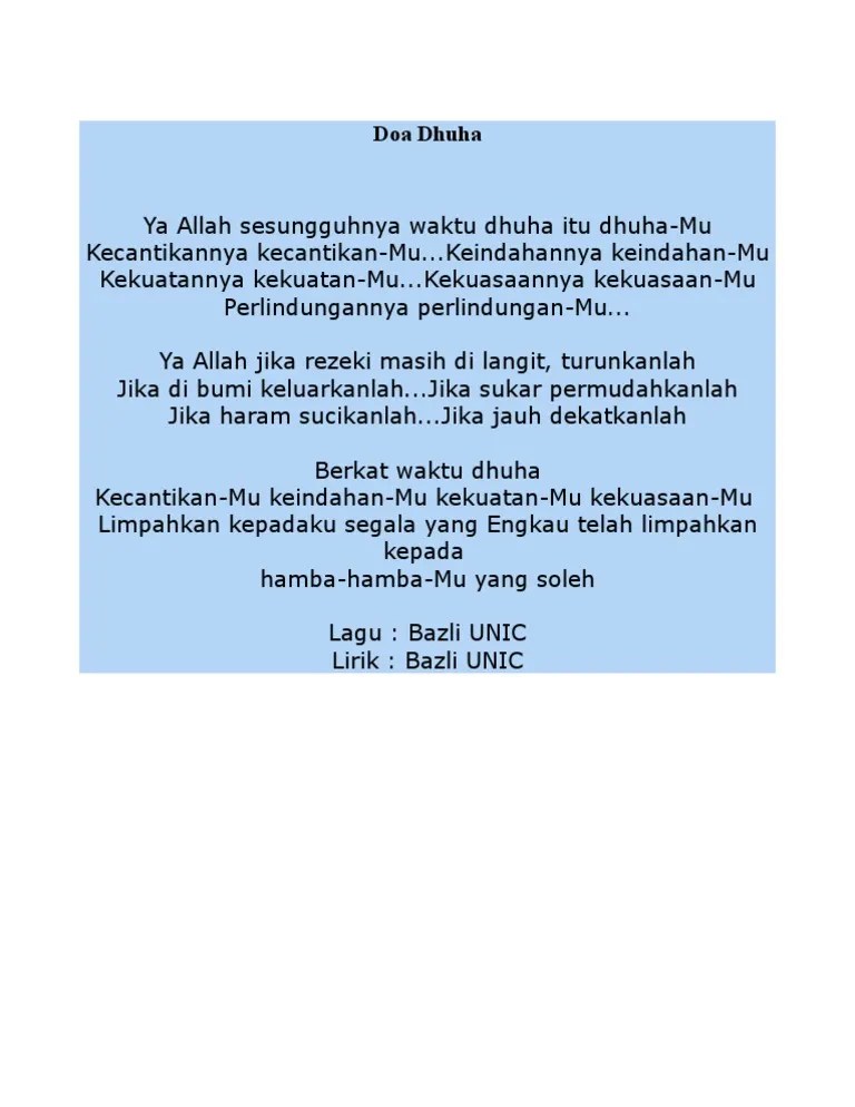 Lirik Lagu Doa Dhuha / Amalkan Doa Dhuha. اللهم ان الضحاء ضحاءك / والبحاء بحاءك / وجمال جمالك / والقوة قوتك / والقدرة قدرتك / والعصمة عصمتك / اللهم ان كان رزقي فى السماء فأنزله . Layanan mobile dari situs entertainment terbesar indonesia, kapanlagi.com. Doa dhuha terbaik unic (lirik lengkap). Doa dhuha lirik lagu unic. Lagu doa dhuha daripada unic. Doa dhuha (unic) + lirik lengkap. Doa yang boleh diamalkan setelah solat sunat dhuha.